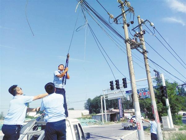 连日来,川汇区坚持问题导向,持续深化整改,扎实推进“五城联创”工作开展。图为城管队员剪除过街线缆。记者 韩志刚 摄