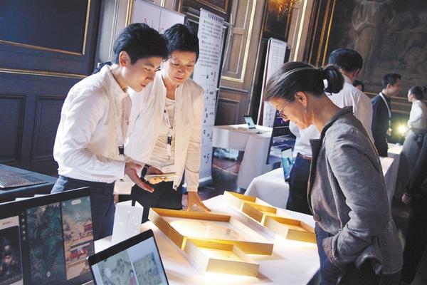 8月20日,在丹麦首都哥本哈根,中国设计师与参观者交谈。