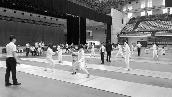 8月21日,省十三运会青少年竞技组现代五项比赛在市体育中心体育馆拉开帷幕,首先进行的是女子甲组击剑单项比赛。 现代五项是一项综合性项目,击剑作为其中一个单项,采用的剑种是重剑,与专业击剑的比赛方式有一定的区别。比赛采用一剑(一分钟)定胜负规则。图为比赛现场。记者 牛思光 摄
