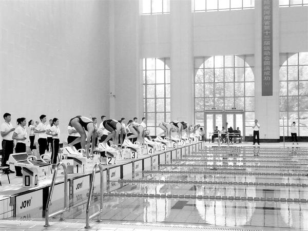 8月21日上午,省十三运会青少年竞技组现代五项游泳比赛在新建的市游泳馆举行。当天进行的是女子甲组、乙组的个人赛,共有43名运动员在水中一展英姿。图为运动员准备入水。 记者 张志新 摄