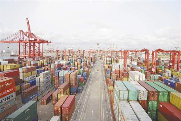 ▲这是2018年8月2日在斯里兰卡科伦坡国际集装箱码头拍摄的集装箱和龙门吊。