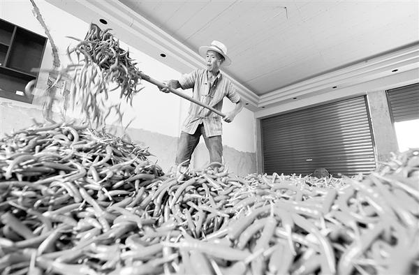 8月22日,贵州省铜仁市松桃苗族自治县盘石镇芭茅辣椒种植基地,当地村民在晾晒辣椒。