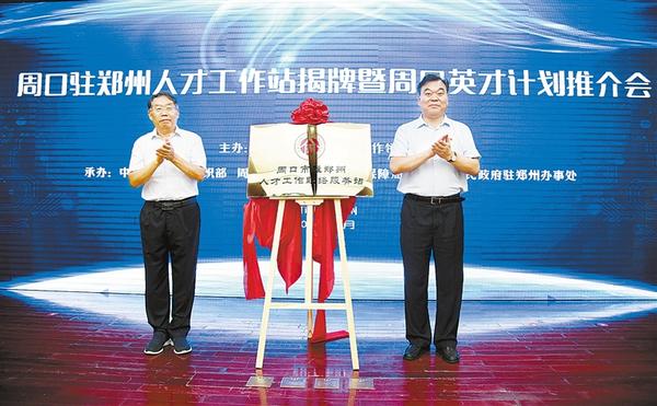 本报讯 (首席记者 刘彦章) 人才是经济社会发展的“第一资源”。进入新时代、站在新起点的周口如何集聚人才,为跨越发展提供人才支撑和智力支持?8月26日上午,我市在省会郑州举行驻郑人才工作站揭牌暨周口英才计划推介会。中国工程院院士、省农科院院长张新友,中国工程院院士、郑州大学教授王复明,教授、博导、河南工业大学原校长、周口驻郑州人才工作站名誉站长王录民,市委书记、市委人才工作领导小组组长刘继标,市委常委、组织部长岳文华,市政协副主席李海燕等出席推介会。