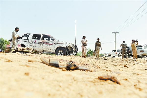 8月25日,在阿富汗贾拉拉巴德市,安全人员在炸弹爆炸袭击现场调查。阿富汗警方25日消息说,阿东部城市贾拉拉巴德市内一个集会现场,当天遭遇自杀式炸弹爆炸袭击,造成包括一名袭击者在内至少3人死亡,4人受伤。新华社发