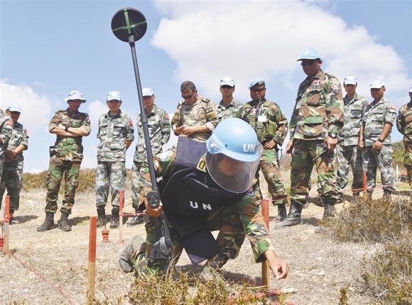 8月27日,在黎巴嫩与以色列边境“蓝线”附近,中国和柬埔寨赴黎巴嫩维和部队官兵观摩柬方扫雷作业。中国和柬埔寨赴黎巴嫩维和部队27日在黎巴嫩与以色列边境“蓝线”附近一处雷场组织现场研讨活动,就如何安全高效开展扫雷作业交流经验做法。 新华社发