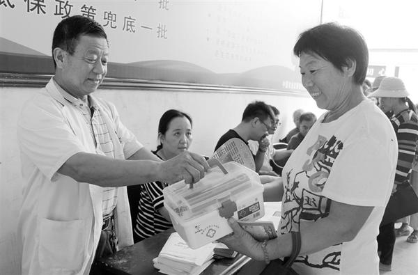 8月29日,扶沟县大新镇陈楼村一位贫困群众从医务人员处领取保健箱。