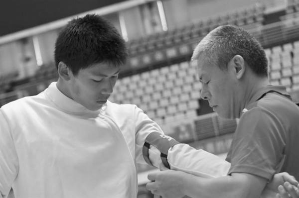 肩上背着相机包,手里拿着水杯,跟着儿子进入赛场,看儿子准备上场,忙替儿子系上代表队标志。在省运会青少年竞技组现代五项击剑比赛现场,来自安阳市的乔东茂是众多来周口为孩子加油助威的家长之一。