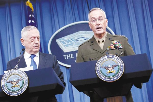 8月28日,在美国华盛顿五角大楼,美军参谋长联席会议主席邓福德(右)与国防部长马蒂斯出席记者会。
