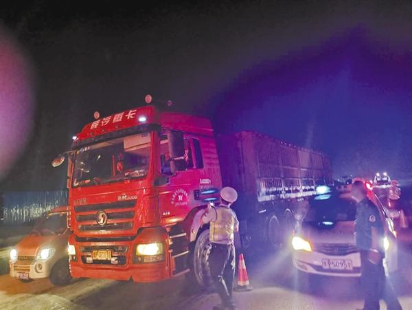 当晚7时许,周口港区管委会组织区攻坚办、控尘办、渣土办、公安、交警、运管、环保、城管等多个部门,出动执法车辆9辆、执法人员39人,组成两个联合执法督查组,在武盛大道与周项路交叉口,对过往车辆进行检查(如图)。