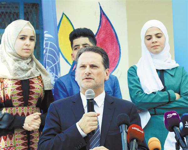 9月2日,在约旦安曼一所联合国近东巴勒斯坦难民救济和工程处(近东救济工程处)为当地巴勒斯坦难民营开办的学校,近东救济工程处总干事皮埃尔·克朗恩布尔(前)致词。