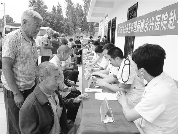 9月6日,市机关事务管理局联手周口永兴医院到高朗乡中黄村开展义诊活动。该局局长辛廷斌、副局长罗碧华到现场指导工作。图为义诊现场。