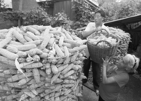 秋收时节,商水县120多万亩秋作物陆续成熟,当地农民抢抓当前天气晴好的有利时机抢收秋作物,确保颗粒归仓。图为9月14日,商水县袁老乡马庄村农民正将玉米棒装进“铁丝网囤”中晾晒。②5