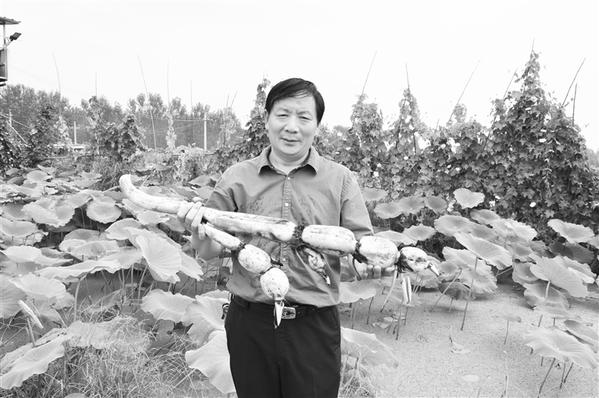 化河乡宁楼村农民种植泰国花奇莲等浅水藕500多亩,并在藕池内套养金鱼、泥鳅、龙虾等,亩收入3万多元。图为喜获丰收的农民 。 记者 付永奇 摄