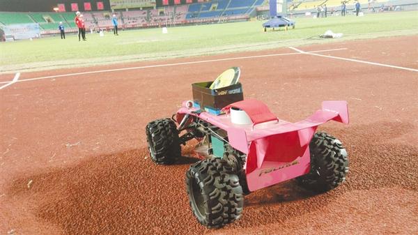 9月16日晚,在省十三运会青少年竞技组田径比赛的铁饼赛场上,一辆运送铁饼的红色“遥控小汽车”特别引人关注,它来回奔波在赛场之上,主要任务帮助运动员运送铁饼。记者 张洪涛 摄