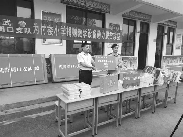 近日,武警周口支队深入商水县汤庄乡付楼村,为付楼小学捐赠多媒体教学一体机2台,为该校学生捐赠书包、文具盒、作业本等学习用品,受到该校师生热烈欢迎。记者 陈军强 通讯员 赵红超 摄