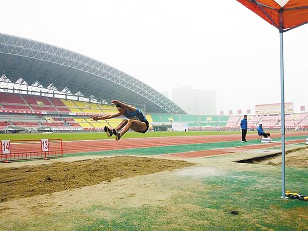 9月20日上午,在省十三运会青少年竞技组田径比赛青年组男子三级跳远比赛中,洛阳选手代鹏祥(如图)跳出14.49米的成绩,将冠军收入囊中,新乡选手李星辉和漯河选手岑伊行分获亚军和季军。