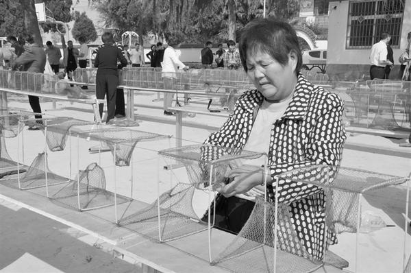 今年以来,商水县出台奖补政策,对全县建档立卡户未就业劳动力实施渔网编织兜底工程,免费为贫困户发放渔网编织架和编织工具,免费传授技术。图为10月9日上午,郝岗镇程庄村渔网编织教学现场。 记者 付永奇 摄