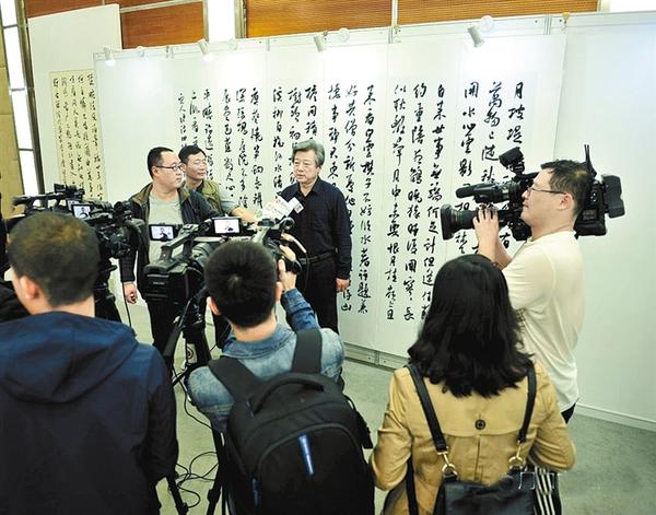 王学岭在接受记者采访时非常接地气。作为从家乡走出的军旅书法家和博学大成、深深了解周口文化的著名学者,他的语言充满了浓郁的乡情乡音。王学岭说:“首先,展览的名称很好。这次周口市书画名家推介活动,突出的是‘推介’。我的理解是,‘推’具有‘推出’和‘推动’两层意思,推出的是书画人才、书画大家,推动的是整个周口的书画界乃至周口地域文化的大发展、大繁荣。‘介’就是介绍,将具有非凡艺术造诣、卓有成就的艺术家分期分批介绍给大众。周口市委、市政府的这个举措振奋人心、十分有益。推介活动搭建的是书画展示平台,唱的却是周口文化大戏,传播的则是厚重的周口地域文化。这种做法是地方坚持并实践文化自信的创新尝试。”