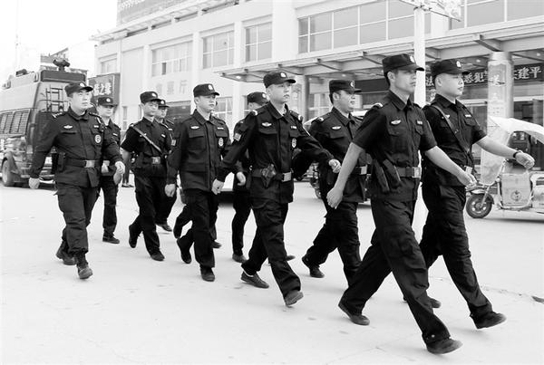 国庆期间,扶沟县公安局特巡警大队加大巡逻防控力度,将警力投放到车站、商场、景区等人员密集场所,确保群众欢度佳节。图为值勤民警在街上巡逻。
