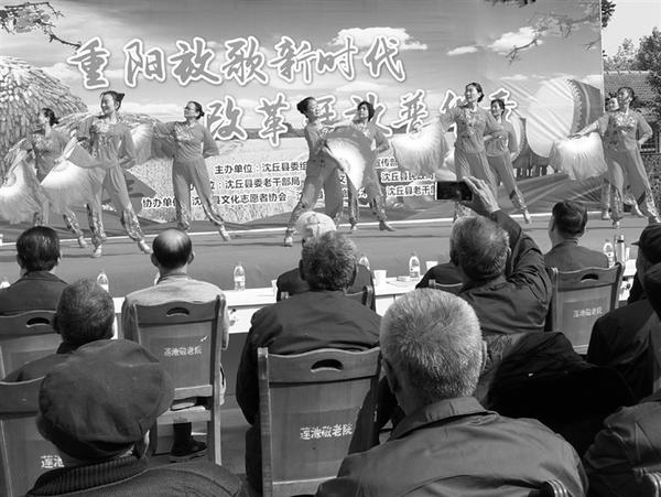 在一年一度的重阳节到来之际,沈丘县委组织部、宣传部、老干部局联合举办了以“重阳放歌新时代 改革开放谱华章”为主题的慰问演出活动,弘扬敬老爱老传统,向老人们致以节日的问候和祝福。图为在该县莲池镇敬老院,老人们聚在一起观看演出,在欢声笑语中喜度重阳节。 韦伟 黄海涛 摄