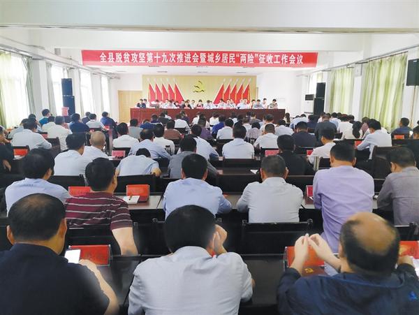 本报讯 (记者 韦伟 通讯员 柳柯 程健 郑东建 文/图) 10月9日,沈丘县召开脱贫攻坚第十九次推进会暨城乡居民“两险”征收工作会议(如图)。皇甫立新、贾庆伟、殷晓春、赵振、杨所超、郭宇、郝四春、曹新旺、王琳、马伟、夏立文、梁熙等在家的县四个班子领导及副处级以上干部出席会议。县委各部委常务副职,各乡镇(办)党(工)委书记、乡镇长(办事处主任)、扶贫副书记、分管城乡居民医保工作副职、扶贫办主任,县直各单位“一把手”,有驻村任务的二级机构负责人,以及县脱贫攻坚督导组组长参加了会议。