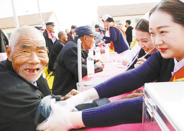 为继承尊重老人、关爱老人的优良传统美德, 10月17日,在重阳节到来之际,鹿邑县妇联工作人员与县人民医院医务工作者、巾帼志愿者一起到赵村乡敬老院开展义诊活动,为老人们量血压、测视力,与老人们共度重阳节。图为赵村乡义诊活动现场。①9