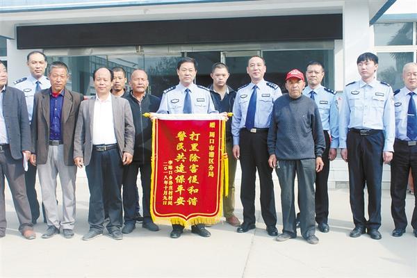 10月9日上午,李埠口乡孙庄村的数十名村民代表将写有“打黑除害促和谐,警民共建保平安”字样的锦旗和感谢信送到了周口港区公安分局政委何学民的手中(如图)。村民代表对该局铁腕铲除“村霸”、维护孙庄村和谐稳定的做法表示由衷感谢。