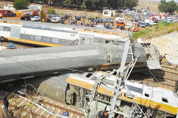 ② 火车脱轨 这是10月16日在摩洛哥北部小镇布格纳代勒拍摄的事故现场。摩洛哥国家铁路局官员16日说,当天上午在摩洛哥北部发生火车脱轨事故。
