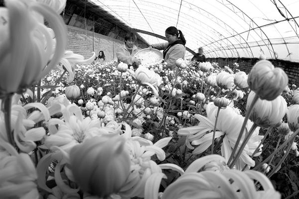 10月21日,河北省张家口市宣化区塔儿村乡窑子头村“扶贫温室大棚”的员工在采摘鲜食菊花。