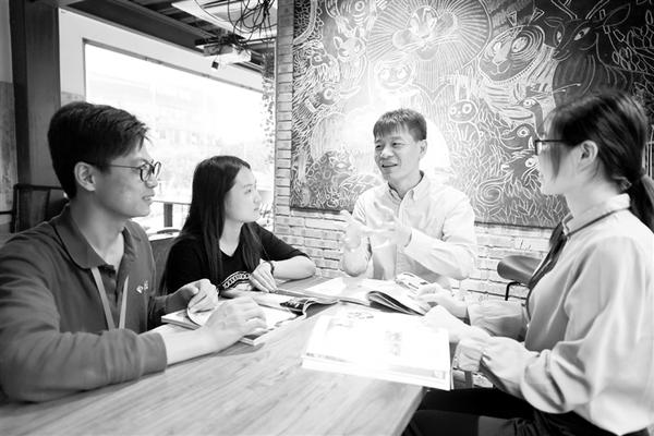 10月23日,来福州创业的台湾青年李儒钦(右二)在福州市台湾青年创业就业基地“索佳艺”众创空间与两岸青年交流。