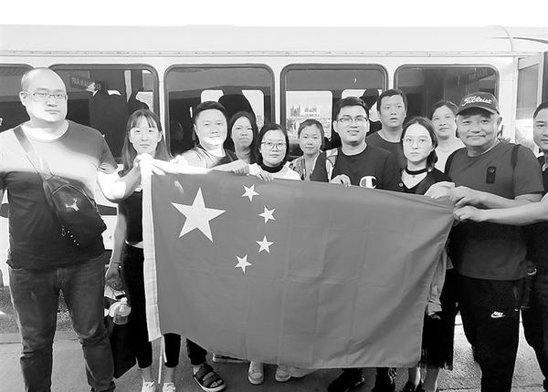 10月28日,在美属北马里亚纳群岛首府塞班岛,几名中国游客在启程前与国旗合影。