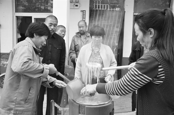 邓城镇敬老院是省级文明敬老院,内设太阳能淋浴房、理发室、医务室、健身室、餐厅等,平时合理安排老人膳食,制定科学营养食谱,对不方便到餐厅就餐的老人送饭到住室。图为昨日敬老院护工在为老人们盛饭。 记者 付永奇 摄