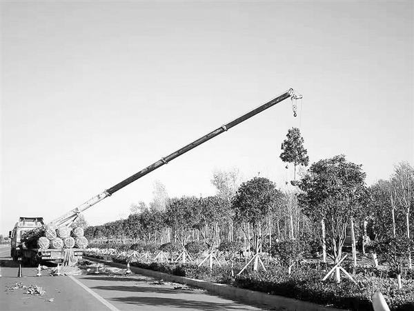 帛亭路是经永登高速公路进入扶沟城南新区的主干道。扶沟乘着百城建设提质工程的东风,在帛亭路两侧大量栽种绿植,扮靓了扶沟的迎宾大道,构建了生态优美的家园。图为10月27日,吊车将树木移向种植点。 记者 谢永静 摄