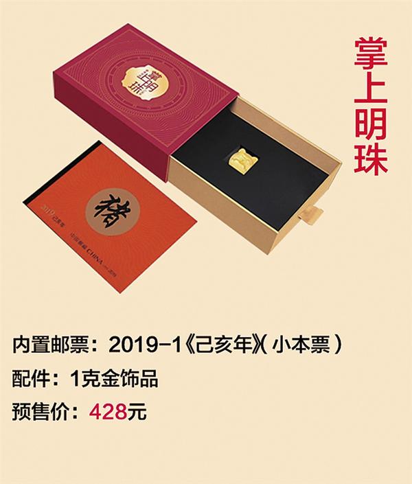 三、《掌上明珠》福珠·邮票珍藏 内置2019《己亥年》生肖小本票,配3D硬金金猪饰品,精致独特、造型可爱,兼具收藏价值和实用价值,预售价428元。 小本票是将面值相同的数枚邮票连印在一起并装订成册的小本册,除了邮票外,还包含有邮票文字介绍、,设计者生活照、亲笔签名、生平简介、获奖作品的介绍。该产品作为新年礼物、本命年礼物、商务馈赠等是一款小巧精致的生肖伴手礼。