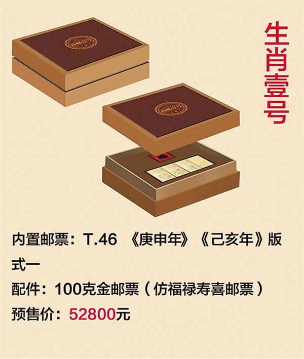 八、《传家宝·珍邮1号》 《庚申年》邮票是中国第一套生肖邮票,是中国邮市的神话、生肖邮票的传奇、邮票市场的风向标!将福禄寿喜邮票金与《庚申年》邮票有机组合,弥足珍贵,堪称“珍邮1号”。 传家宝系列产品之所以称得上“宝”,一是传家宝系列产品的金砖包装上均贴有全国统一的防伪标签,由国家邮票印制局统一印制。二是限量发行,数量与收藏证书一一匹配。三是加工制作采用国内知名厂家,业界一流工艺水准、专业质量检测,加工中普遍运用了热压起鼓、磨砂UV等工艺,做到工整华丽、细腻精工。预售价52800元。