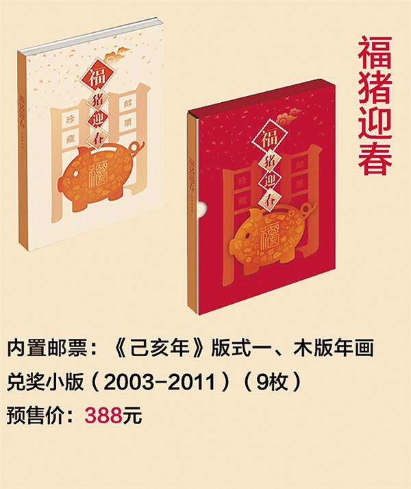 二、《福猪迎春》邮票珍藏册 以“肥猪旺福”“五福齐聚”为切入点,用邮票、插图生动阐述福文化的内涵。内置《己亥年》大版邮票,木版年画兑奖小版一套9枚,预售价388元。 该邮品将中国邮政2003年至2011年,每年腊月二十三发行的木版年画系列邮票全部收齐。年画系列邮票深受市场推崇,浓郁的民俗特色,系列发行的特点,由知名邮票设计家担纲设计,在票幅、枚数和设计风格上保持和谐统一,每枚邮票都蕴含纳福、辟邪、守护的吉祥寓意,收藏价值日益彰显。
