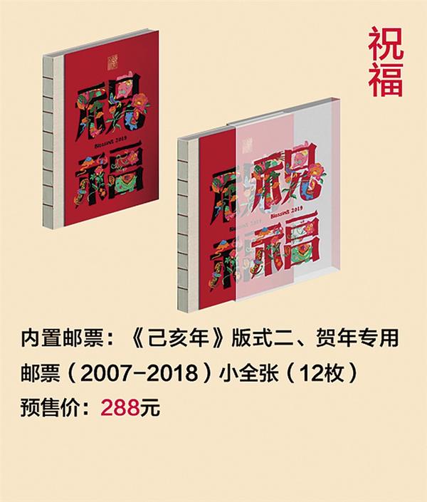 一、《祝福》邮票珍藏 以生肖贺岁为主题,搭配对应祝福类题材邮票,表达对个人幸福、家庭和睦的美好追求和向往。内置《己亥年》生肖邮票小版、贺年专用邮票小全张共12枚,预售价288元。 贺年专用邮票是中国邮政每年为农历新年发行的一种特殊邮票形式,自2007年至2018年累计发行12组,形成了一个特殊的收藏系列,其设计风格统一,富有传统文化色彩,小全张更是精美绝伦,是值得欣赏与收藏的佳品,每一枚邮票都载满了浓浓祝福。