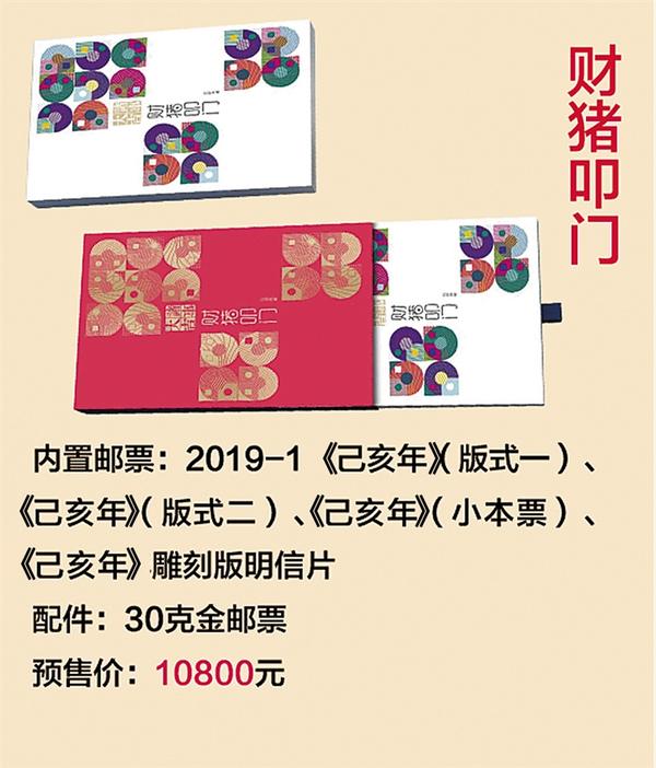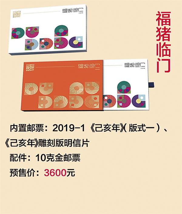 四、《福猪临门》 收录了备受市场关注的收藏热点《己亥年》大版邮票,独家限量发行的《己亥年》雕刻版明信片、10克仿印《癸亥年》金猪邮票。表达福气临门、好运连连的浓浓祝福,预售价3600元。 产品内含有河南集邮独家限量发行的《己亥年》生肖邮票雕刻稿明信片,届时更有邮票雕刻稿作者、设计者等大咖现场签字,更显珍贵。