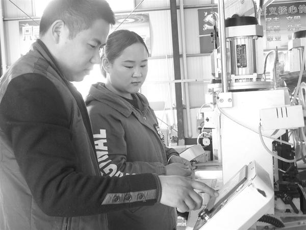 11月4日,沈丘县付井镇赵口村一处电子组装“扶贫车间”,专业技能培训老师正为一名新进厂的女学员做指导示范。