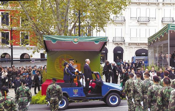 11月4日,在葡萄牙首都里斯本,葡萄牙总统德索萨(中右)在阅兵式上检阅部队。