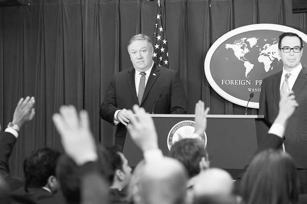 11月5日,在美国首都华盛顿,美国国务卿蓬佩奥(后左)和财政部长姆努钦(后右)出席记者会。美国财政部5日发布通告说,将从当天起对涉及伊朗金融、航运、航空、能源等领域的超过700个个人、实体、飞机和船只实施制裁,其中包括50家伊朗银行及其境内外分支机构、伊朗国有航空公司及其旗下的67架飞机和伊朗原子能机构。美国国务卿蓬佩奥当天在记者会上说,美国将暂时允许8个国家或地区在美重启对伊朗制裁后继续购买伊朗石油。新华社记者 刘杰 摄