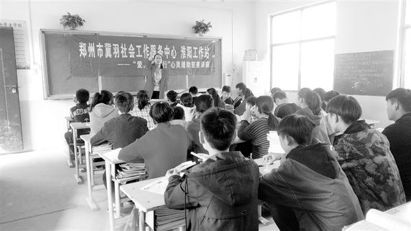 日前,淮阳县鲁台镇人大主席团联合郑州冀羽社会工作服务中心淮阳工作站,特邀国家二级心理咨询师王雪莲,以《人生有规划,轻松赢未来》《有规划的人生,青春更精彩》《我的人生,我有思考》为主题,为鲁台一中学生进行了“爱与你同行”心灵援助慈善讲座,引导孩子们健康成长。图为王雪莲正在为孩子们进行心理辅导。