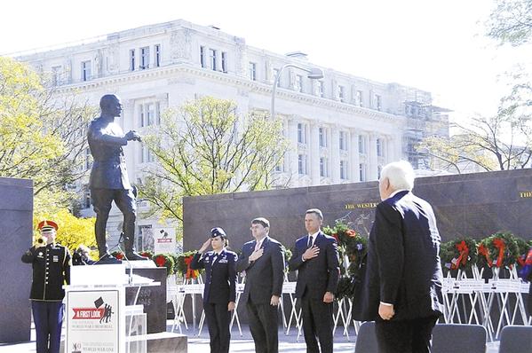 11月8日,在美国华盛顿,人们参加美国国家一战纪念碑落成仪式。在白宫附近的潘兴公园,美国50个州和海外领土的代表8日向刚刚落成的美国国家一战纪念碑敬献花圈,开启了全美纪念第一次世界大战结束一百周年的系列活动。