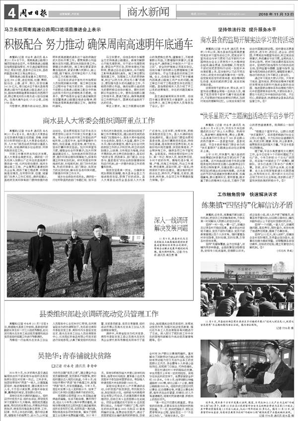 周南高速公路是省重点工程项目,全长205公里,途经宛城、社旗、舞钢、驻马店、上蔡、遂平、周口,投资估算141.25亿元。周口起点位于商水县商周高速公路与宁洛高速公路互通式立交处,路线向南跨越漯阜铁路后向西南行进,跨过青龙沟后从商水进入驻马店境内。在商水境内全长17.12公里,占地1755亩。