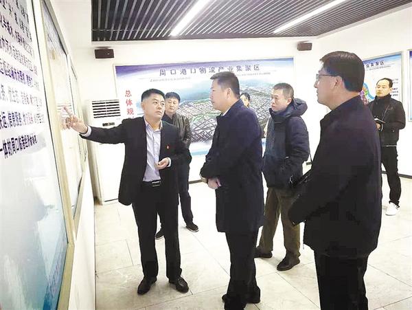 在周口中心港码头,孙红伟从沙颍河通江达海的能力、周口港区的建设、五大园区的规划、码头运营现状与通航年吞吐能力、周口航运如何融入“一带一路”等方面,向贺永召一行进行了详细介绍,并邀请贺永召一行观看了《以港促城》宣传片。