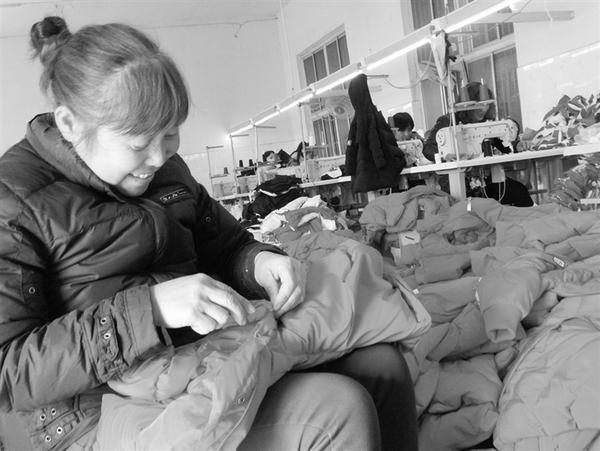 近年来,沈丘县在打响脱贫攻坚战和巩固提升脱贫攻坚成果工作中,大力发展家庭手工业,带动全县5000余名留守妇女家门口就业,年人均增收2万元。左图为11月19日,周营镇马营村留守妇女高英在一个儿童服装加工点忙着剪线头。②5 谢辛凌 摄