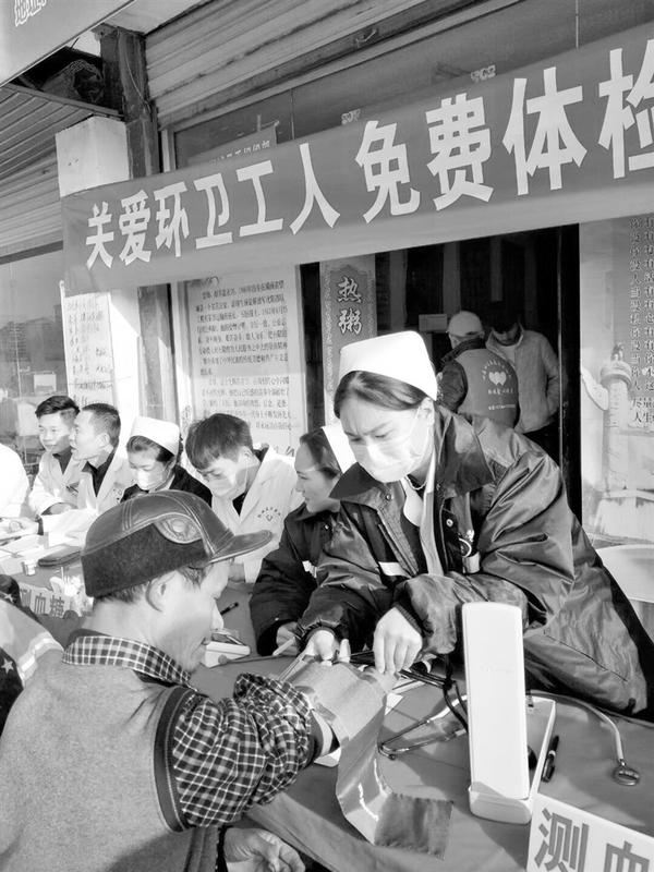 11月20日,郸城县友谊医院组织外科、内外、疼痛科等科室人员,来到该县心连心公益“爱心粥屋”,为环卫工人免费体检身体,送去冬日的温暖和祝福。图为体检现场。 记者 卢好亮 摄
