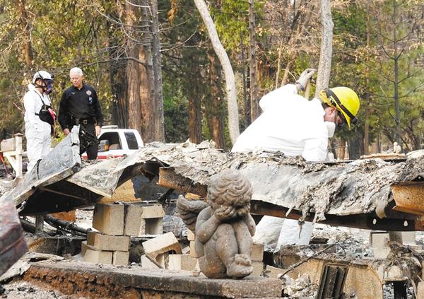 11月19日,在美国加利福尼亚州比尤特县天堂镇,救援人员在山火废墟中工作。