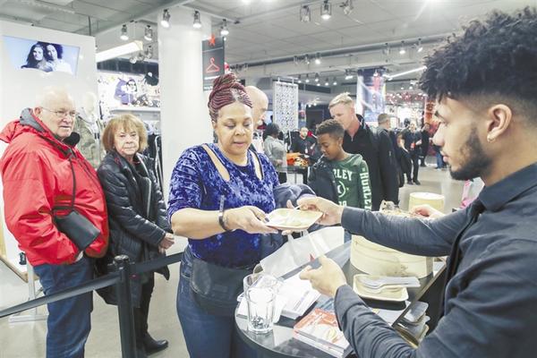 11月19日,在美国纽约梅西百货商场,活动参与者在上海美食节上排队领取免费提供的小笼包。当日,主题为“美食·爱恋·上海”的上海美食节暨上海旅游推介会在纽约开幕。新华社发