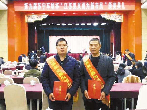11月14日,第九届苏宁环球杯“江苏见义勇为新市民”颁奖典礼在南京举行。项城市新桥镇的曹书志(左)获此殊荣。今年9月,江苏省泗阳县园林绿化管理处工作人员曹书志在驾驶洒水车进行绿化带浇水作业时,看见路边一门面房内浓烟滚滚,立刻把洒水车开到着火点,与他人一起成功将火扑灭。曹越迪 摄